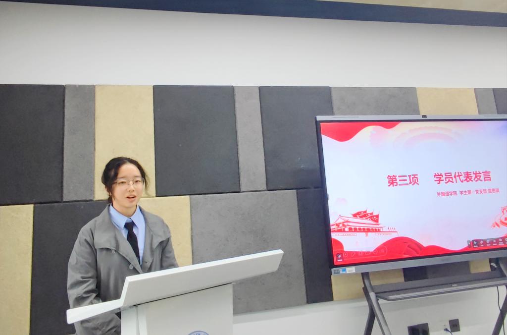 随后,外国语学院雷思琪同学作为学员代表发言。她结合自身成长经历,分享了从对党的朴素感情到坚定理想信念的思想历程,表达了对党组织的感激与向往。她引用习近平总书记对青年的殷切寄语,号召全体学员珍惜学习机会,端正学习态度,严守培训纪律,努力将党的理论知识内化于心、外化于行,在学习、生活和未来工作中发挥先锋模范作用,以实际行动争取早日加入党组织,为实现中华民族伟大复兴的中国梦贡献青春力量。