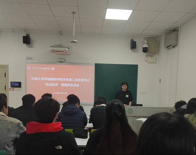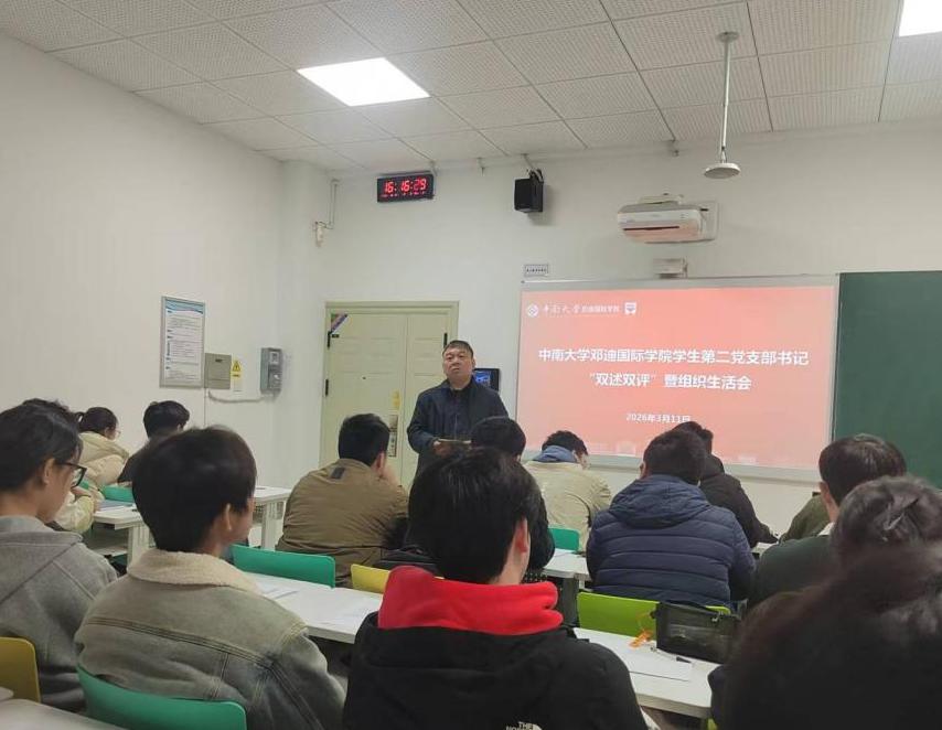 3月11日下午,中南大学邓迪国际学院学生第二党支部在潇湘校区外语楼118教室召开新学期全体党员大会。会上开展党支部书记述职评议、党员批评与自我批评、民主评议党员,开展树立和践行正确政绩观学习教育。