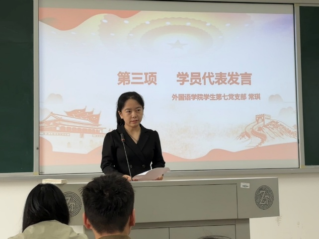 外国语学院常琪同学作为学员代表发言。她结合自身经历,分享了从对党的朴素感情到坚定理想信念的思想成长过程,表达了对党组织的向往与感激。她号召全体学员珍惜培训机会,严守纪律、认真学习,在学习和生活中发挥先锋模范作用,努力向党组织靠拢,争取早日成为一名合格的共产党员。