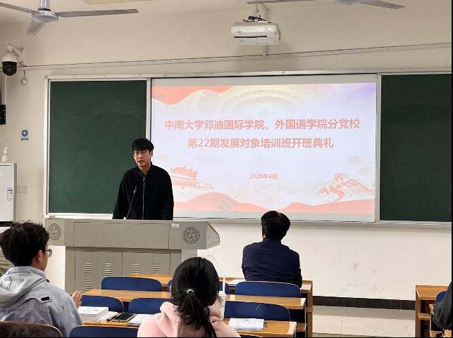 2026年4月15日下午,中南大学邓迪国际学院、外国语学院分党校第22期发展对象培训班开班仪式在外语楼604教室顺利举行。邓迪国际学院党委书记、分党校校长高东波,外国语学院辅导员蒋馨逸出席,培训班班导师宋旭主持典礼。