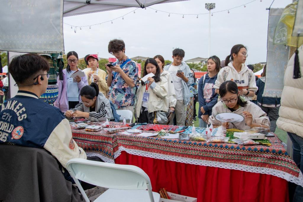 学院展位傣韵浓厚,学生志愿者们使用傣锦、传统挂画及孔雀饰品装点,开启了一场精彩纷呈的傣韵文化盛宴。在“DIY”体验区,学生志愿者耐心指导大家用彩纸、干花等材料制作傣族风格鲜花团扇;在“尝傣味”展台,整齐摆放的鲜花饼、酸角糕等特色小吃,让师生们领略到傣族饮食文化的别样风情。此外,“赏傣风”区域的象脚鼓体验与孔雀舞展示同样备受青睐,载歌载舞的表演将现场氛围推向高潮。