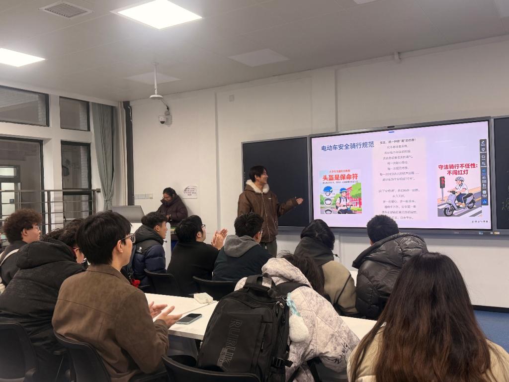 精心策划,创新形式。在学院的总体部署下,各班积极响应,结合专业特色与学生需求,精心设计了班会内容。交设D2501班别出心裁地以“大学生硬核生存指南”为主题,将安全风险类型幽默归纳为“四大刺客”,通过生动风趣的视频教学,使安全教育入脑入心。机械D2302班则聚焦反诈、消防、骑行安全等重点领域,强调“戴头盔是骑行必修课”,切实提升学生交通安全意识。